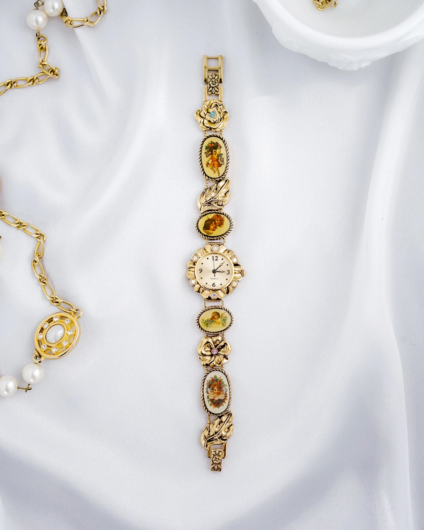 귀여운 아기천사들 그림과 꽃과 리본모양 슬라이드챰이 한 줄로 이어진 형태의 슬라이트챰 시계입니다. 90년대 제품이에요. 꽃을 연상시키는 베젤과 메탈챰에는 오로라빛이 감도는 스톤이 장식되어 은은히 빛나고, 천사 챰에는 명화를 연상시키는 앤틱한 무드의 천사들이 활짝 웃고 있어요. 뒷면에도 아름다운 플라워패턴이 세공되어 있어서 섬세한 느낌이 가득한 아름다운 시계에요. 다이얼의 폰트나 시계바늘, 심지어 버클에도 무늬가 새겨져 있어서 정말 디테일하고 예쁘네요! 현대에는 찾아볼 수 없는 레어하고 앤틱한 디자인이에요.
