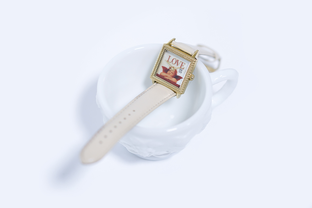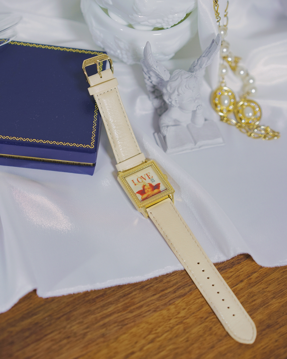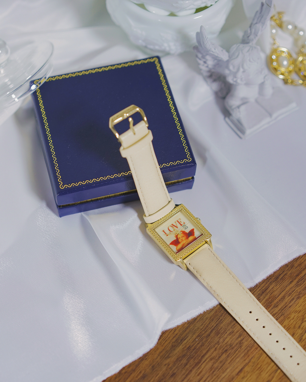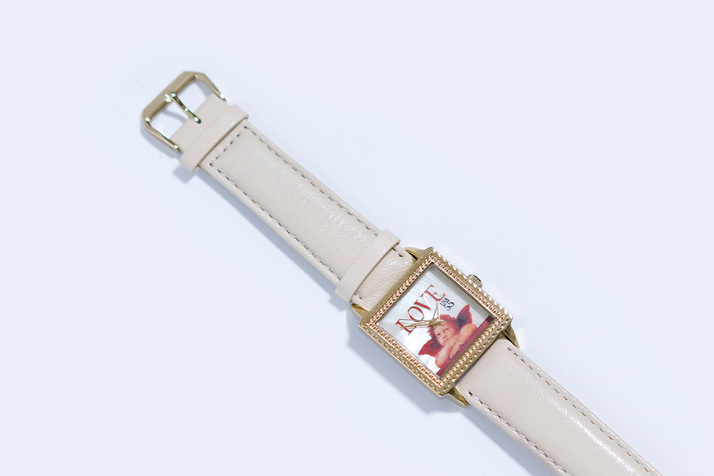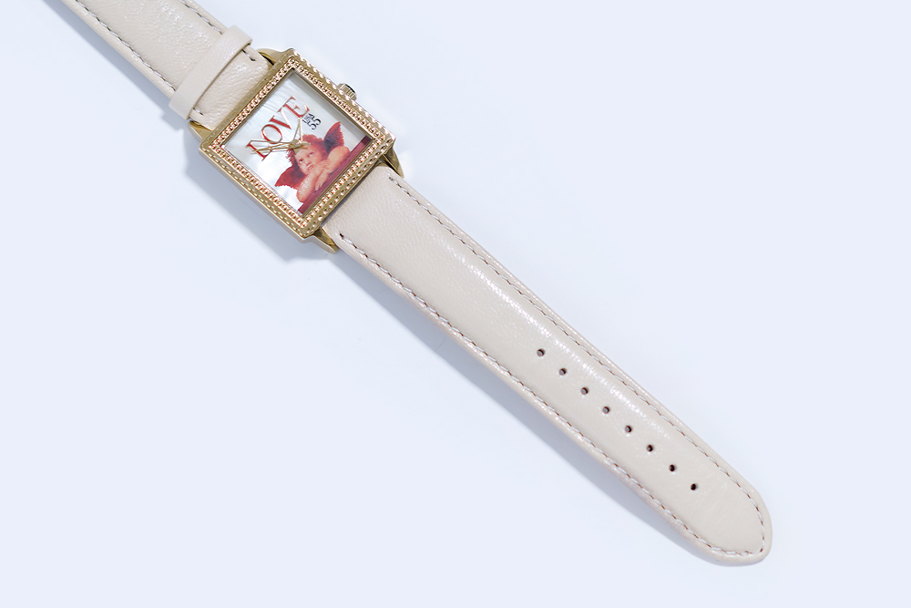 아기천사와 LOVE 타이포가 뿅 들어가 있는 우표 모티브 시계입니다. 미국우정공사(USPS)에서 발렌타인데이 기념으로 판매된 90년대 LOVE 시리즈 우표 일러스트를 시계에 그대로 넣어서 만들어진 제품이에요. 일러스트와 우표 레이아웃도 예쁘고 베젤에도 우표의 커팅라인 무늬를 넣어서 우표 모양을 디테일하게 구현했어요. 아날로그적인 감성이 한가득 담긴 예쁜 시계입니다. 시계판은 자개 소재라서 빛을 받으면 영롱한 색감으로 빛나고, 자개 특유의 고급스러운 텍스쳐도 아름다워요. 2008년대에 판매된 비교적 최신 제품이라서 상태는 정말 좋고 유리도 뒷판도 흠집 없이 정말 깨끗해요. 특히 뒷판은 거울이 연상될 만큼 깨끗한 상태에요. 착용되지 않은 채 오래 보관만 되어있던 새제품 컨디션입니다.