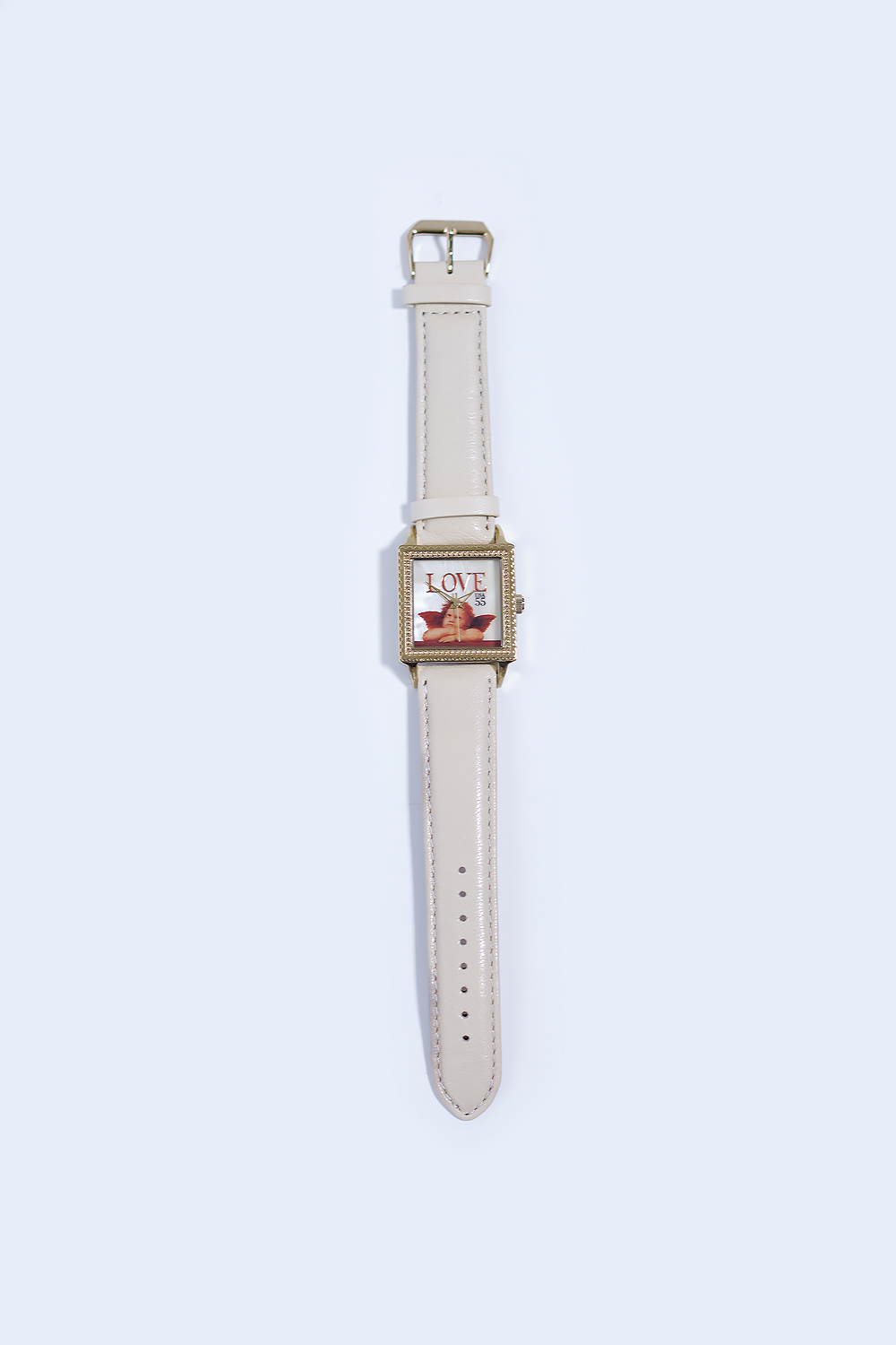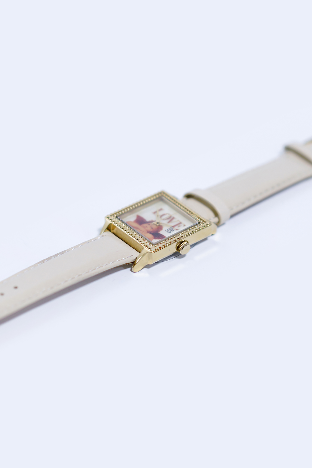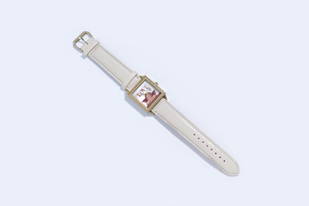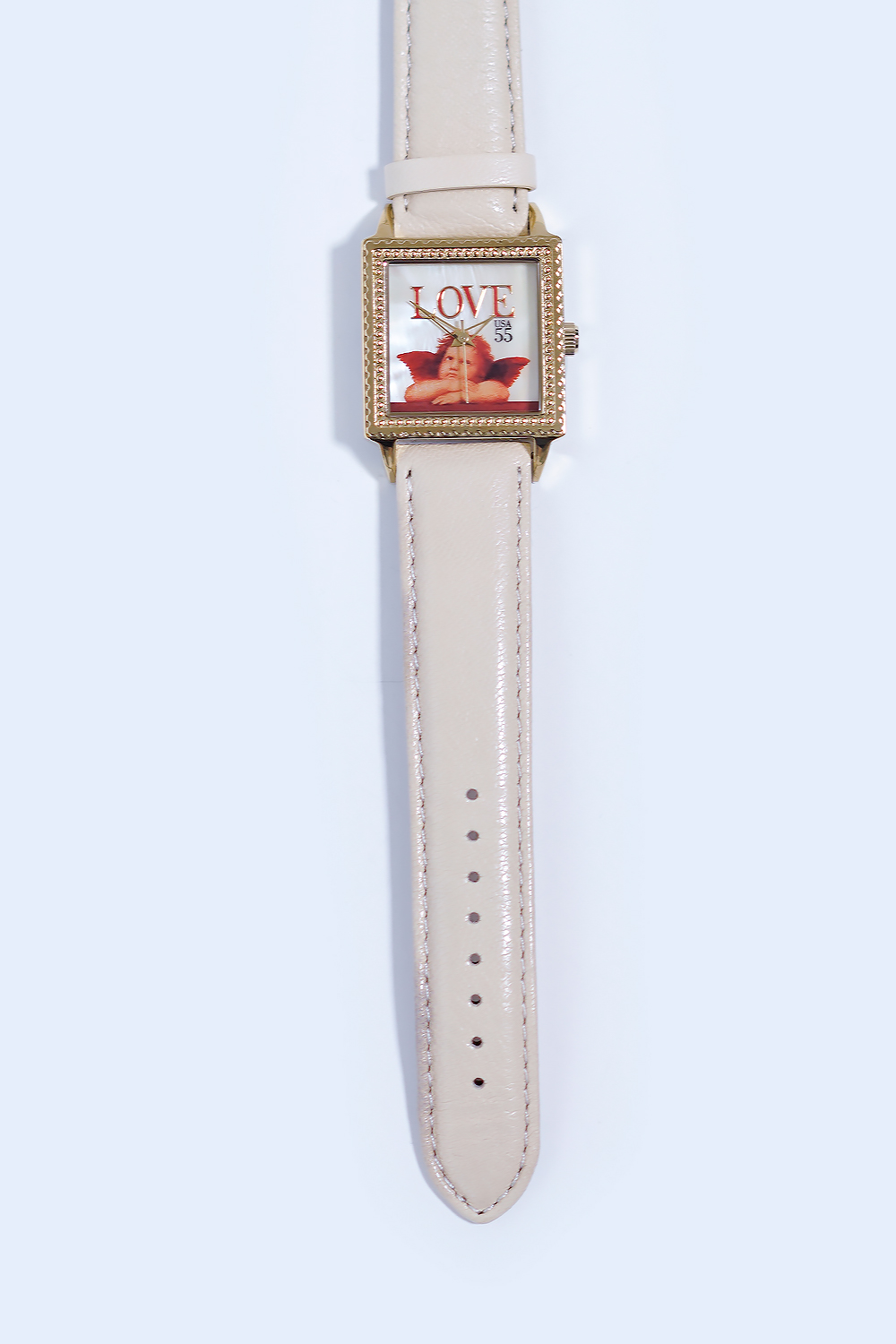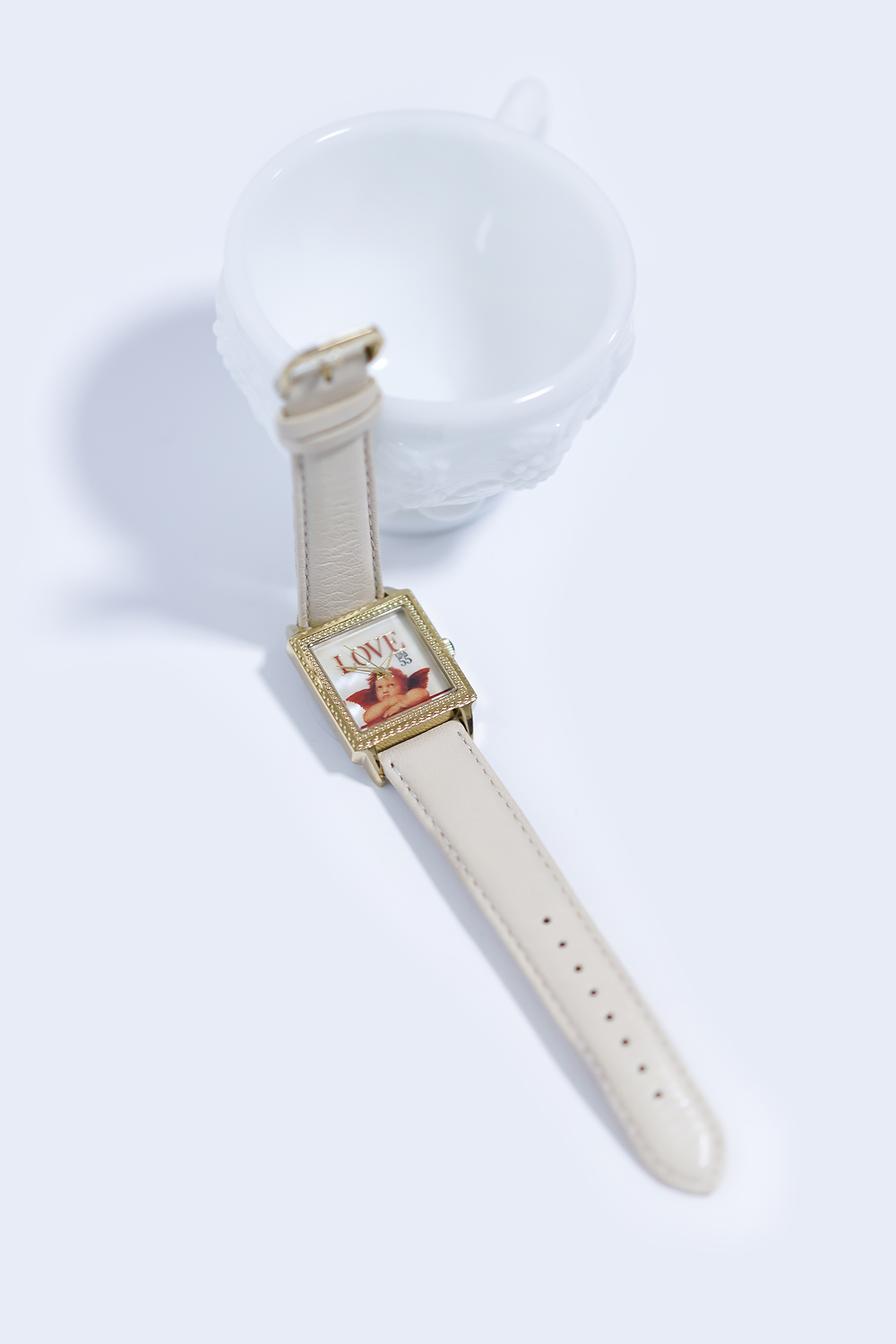 아기천사와 LOVE 타이포가 뿅 들어가 있는 우표 모티브 시계입니다. 미국우정공사(USPS)에서 발렌타인데이 기념으로 판매된 90년대 LOVE 시리즈 우표 일러스트를 시계에 그대로 넣어서 만들어진 제품이에요. 일러스트와 우표 레이아웃도 예쁘고 베젤에도 우표의 커팅라인 무늬를 넣어서 우표 모양을 디테일하게 구현했어요. 아날로그적인 감성이 한가득 담긴 예쁜 시계입니다. 시계판은 자개 소재라서 빛을 받으면 영롱한 색감으로 빛나고, 자개 특유의 고급스러운 텍스쳐도 아름다워요. 2008년대에 판매된 비교적 최신 제품이라서 상태는 정말 좋고 유리도 뒷판도 흠집 없이 정말 깨끗해요. 특히 뒷판은 거울이 연상될 만큼 깨끗한 상태에요. 착용되지 않은 채 오래 보관만 되어있던 새제품 컨디션입니다.