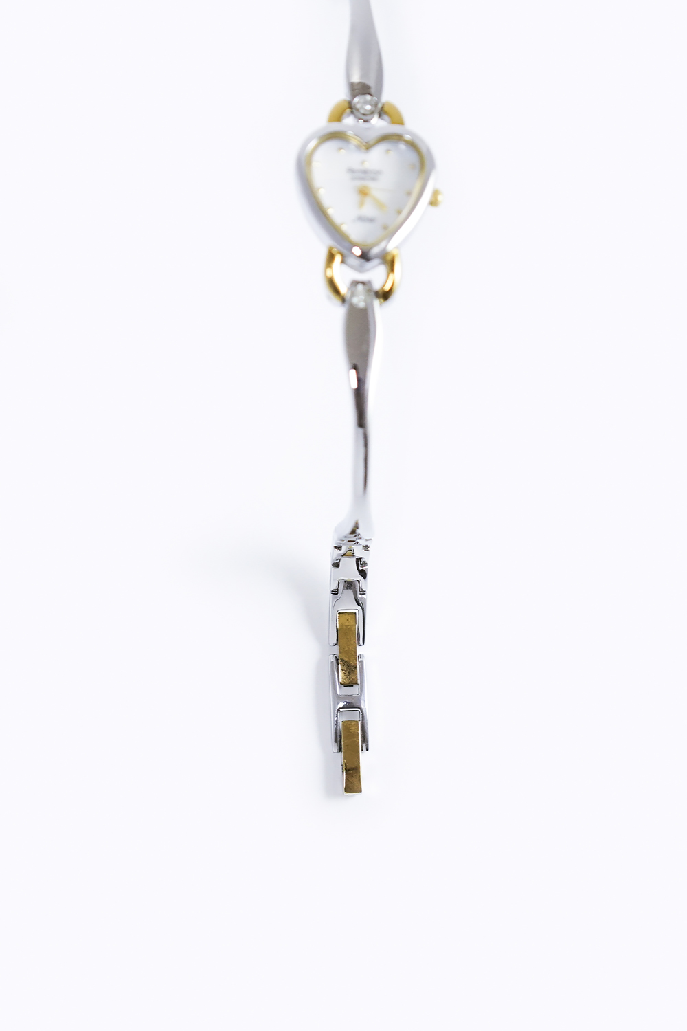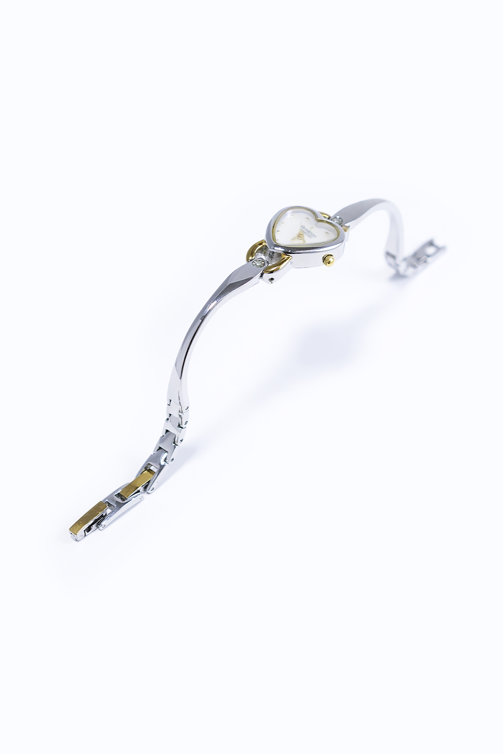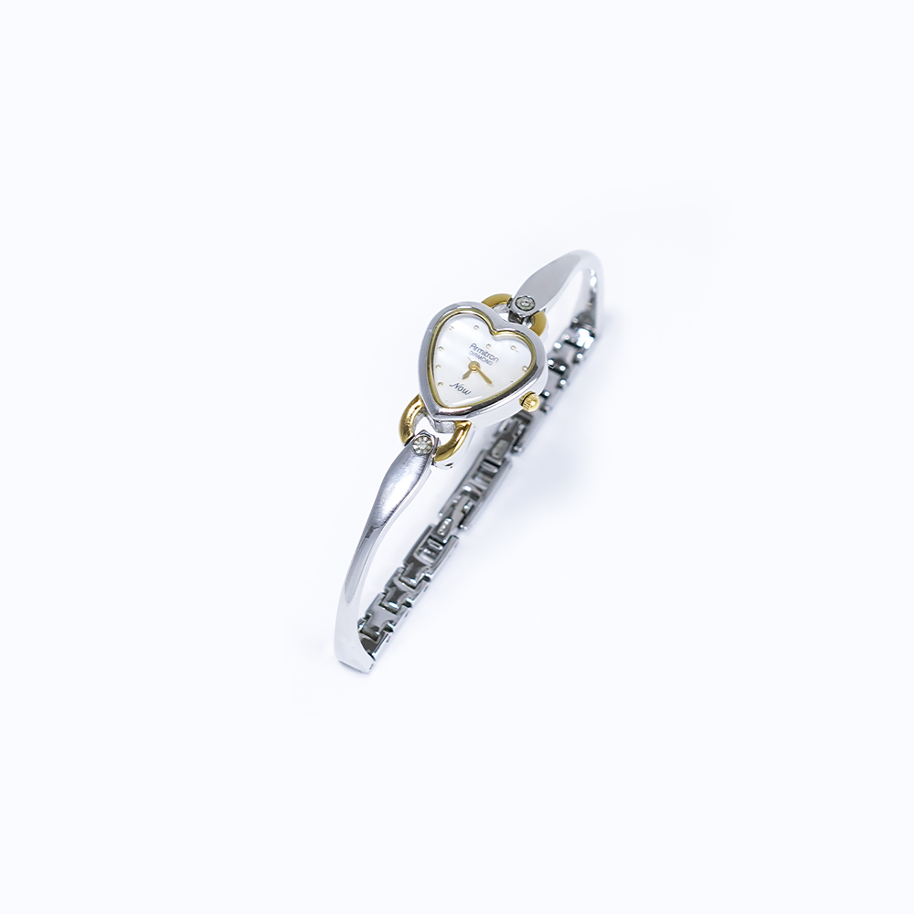 Armitron의 귀여운 하트 뱅글 빈티지 시계입니다. 한국에서는 생소하지만 미국에서는 아직도 다양한 디자인의 시계를 출시하는 브랜드에요. 손목에 착용했을 때 딱 예쁜 사이즈의 하트 시계라서 귀여운 느낌으로 부담없이 착용하실 수 있습니다. 뱅글형이라서 더 귀엽고 아기자기한 느낌이네요! 골드볼 형태로 표현된 숫자판도 귀엽고, 실버톤에 골드포인트로 강조된 디자인도 예뻐요. 시계판은 자개 소재라서 무지개빛으로 반짝반짝 빛나요~