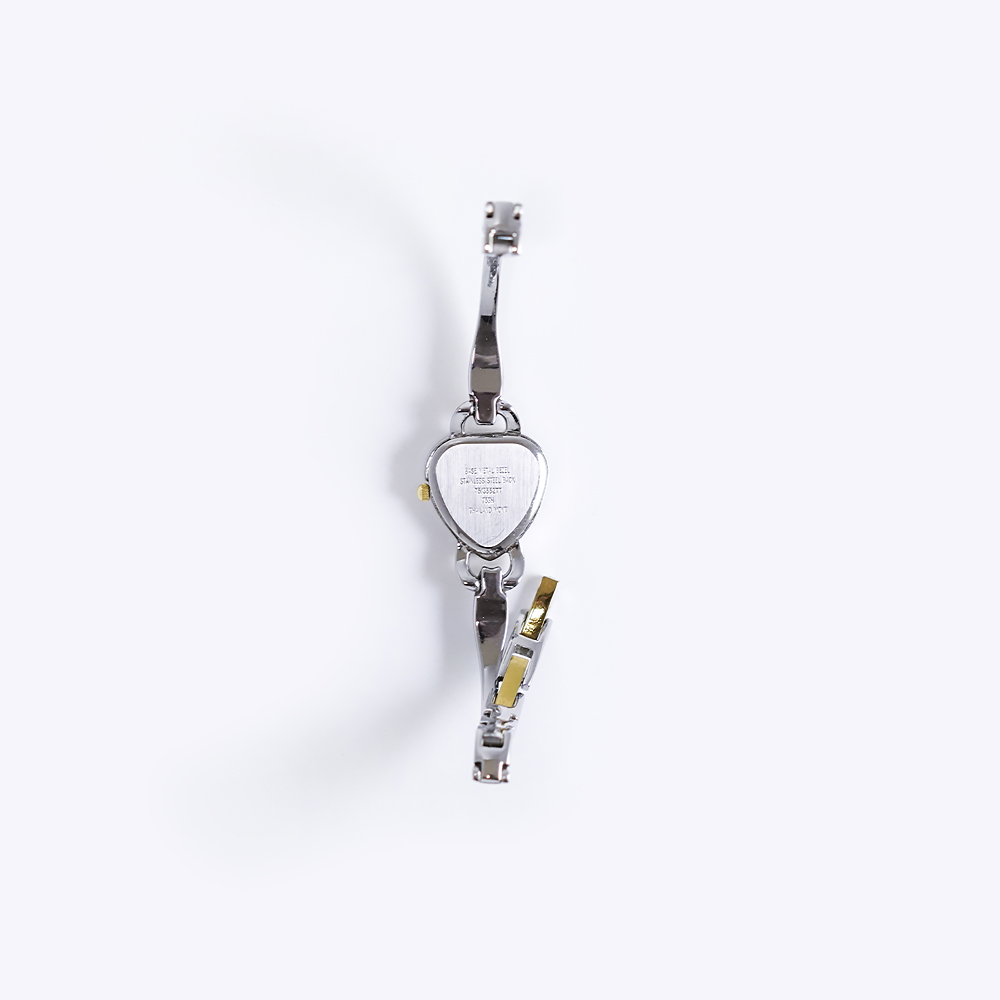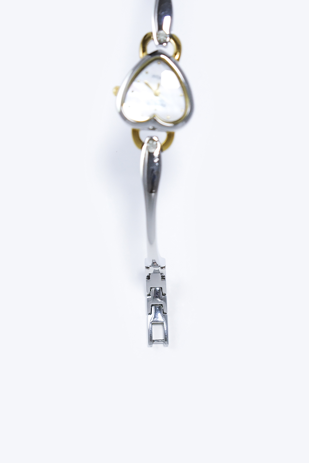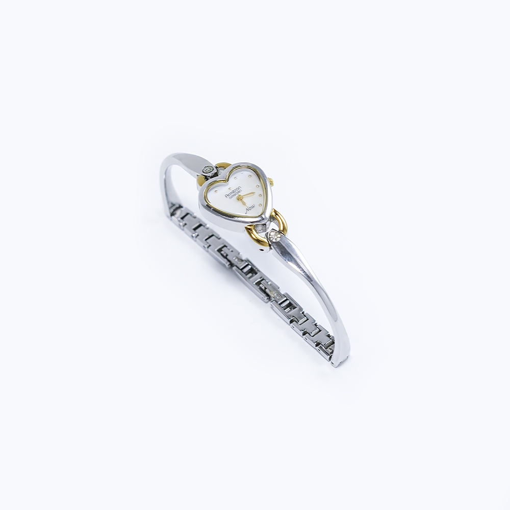 Armitron의 귀여운 하트 뱅글 빈티지 시계입니다. 한국에서는 생소하지만 미국에서는 아직도 다양한 디자인의 시계를 출시하는 브랜드에요. 손목에 착용했을 때 딱 예쁜 사이즈의 하트 시계라서 귀여운 느낌으로 부담없이 착용하실 수 있습니다. 뱅글형이라서 더 귀엽고 아기자기한 느낌이네요! 골드볼 형태로 표현된 숫자판도 귀엽고, 실버톤에 골드포인트로 강조된 디자인도 예뻐요. 시계판은 자개 소재라서 무지개빛으로 반짝반짝 빛나요~