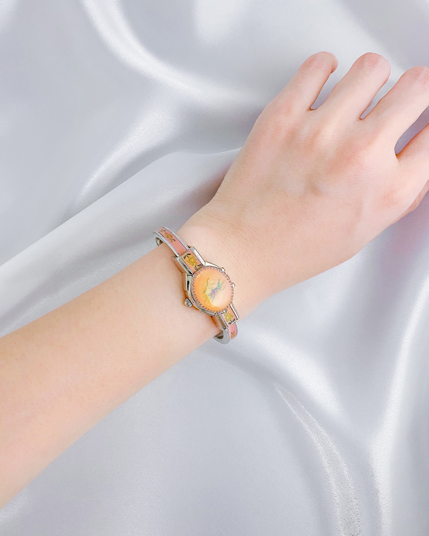 오렌지색 바탕에 연둣빛 꽃무늬가 들어가 있는 실버컬러 플립커버드 시계입니다. 커버를 열면 안에 들어오는 시계가 뿅 나오는 로맨틱한 디자인이에요. 시계인지 팔찌인지 착각이 들 만큼 로맨틱한 디자인이 정말 매력적이에요! 현대에선 자주 볼 수 없는 빈티지감성 한껏 담긴 유니크한 아이템으로 소장가치 있는 디자인이에요. 배터리로 동작하는 쿼츠시계이고, 뱅글타입이라서 프리사이즈에요.