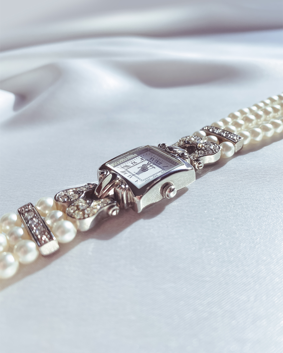 우아한 매력이 느껴지는 섬세한 디자인과 세 갈래의 진주 밴드가 특징인 Gruen사의 시계입니다. 드레시한 느낌을 주는 화려한 디자인으로 자그마한 아티피셜 진주 세 줄이 이어진 스트랩 덕분에 시계가 아니라 팔찌 같은 느낌도 들어요. 실버 바탕에 투명한 라인스톤이 장식되어 전체적으로 깨끗한 느낌을 주어서 화려한 디자인이라도 크게 부담스럽지 않은 거 같아요. 따뜻한 봄에 레이스 원피스와 함께 드레시하게 연출하고 싶어지는 디자인이에요~