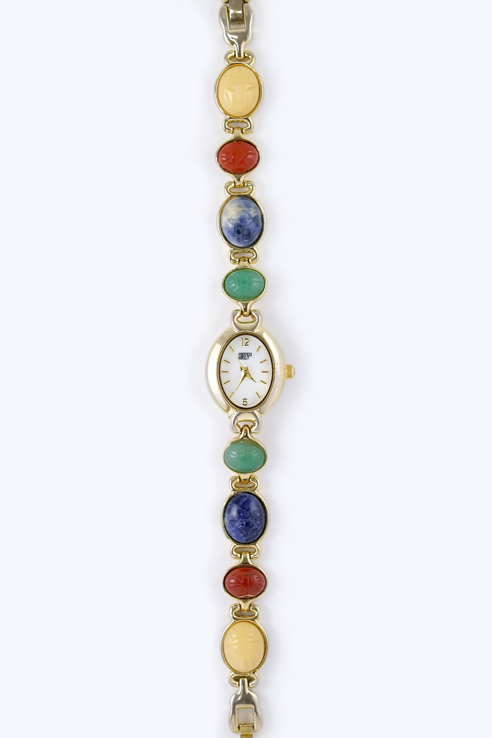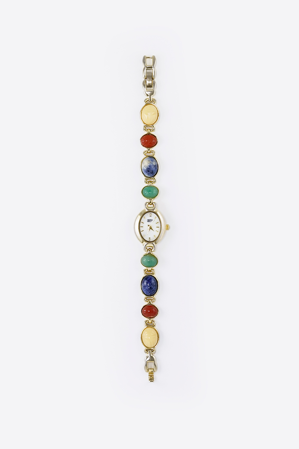 알록달록하고 고급스러운 컬러감의 스톤이 줄지어 연결된 유니크한 디자인의 빈티지 시계입니다. 현대에서 쉽게 찾아볼 수 없는 유니크한 디자인이에요. 시계판은 자개 소재라서 고급스러운 느낌이 들고 각도에 따라 예쁘게 빛나요. 그리고 숫자판도 골드 컬러라서 화사한 느낌이 배가 되네요! 무브먼트는 일본에서, 스트랩은 중국에서 생산되었어요. 시간도 잘 갑니다:)