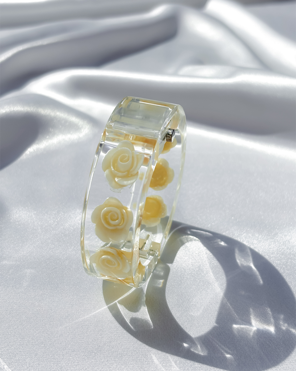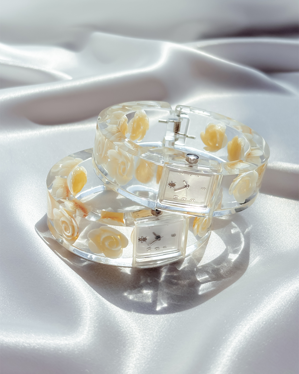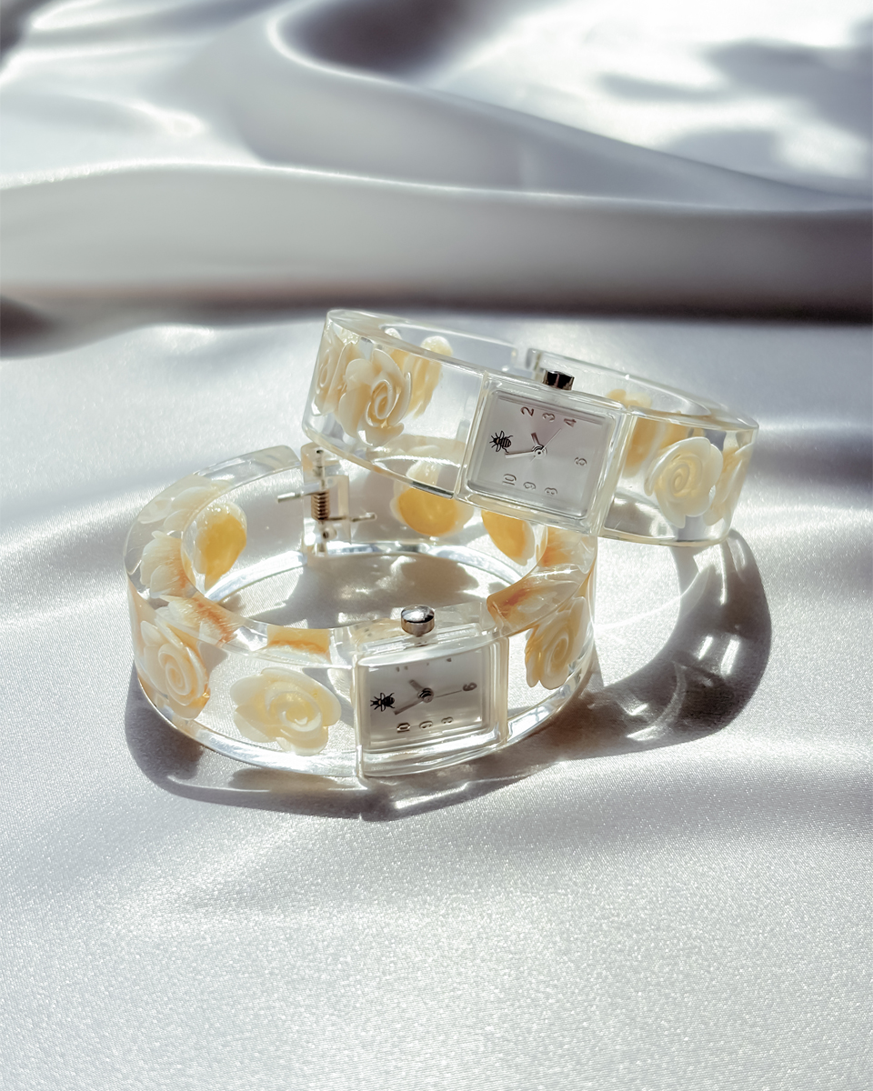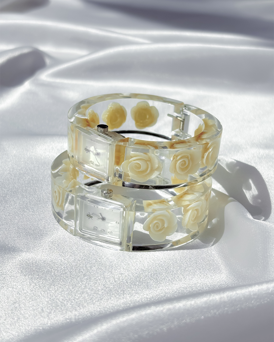 맑고 투명한 루사이트 소재로 제작된 뱅글 스타일의 빈티지 시계 두 점 입고되었입니다. 투명한 소재와 플로럴 디테일이 어우러진 유니크한 디자인이에요. 햇빛을 받을 때마다 유리처럼 빛을 반사하는 질감이 시원하고 깨끗한 인상을 줘요. 햇빛이 부서져 손목 위에서 가볍게 반짝이는 모습이 인상적이네요! 뱅글 내부에는 장미 모티브가 입체적으로 담겨 있어요. 착용했을 때 꽃이 은은하게 비쳐 보여서 독특한 분위기를 만들어내요. 같은 제품이지만 두 점이 미묘하게 다릅니다. 아래쪽에 각각 단독샷 남겨두었어요.