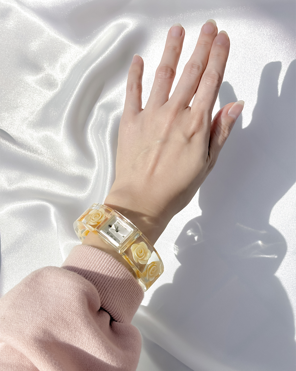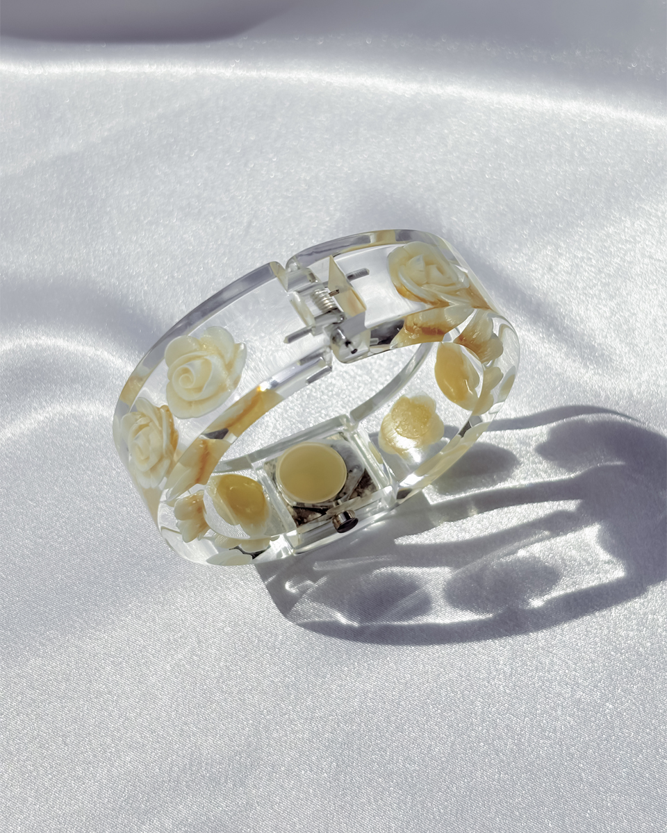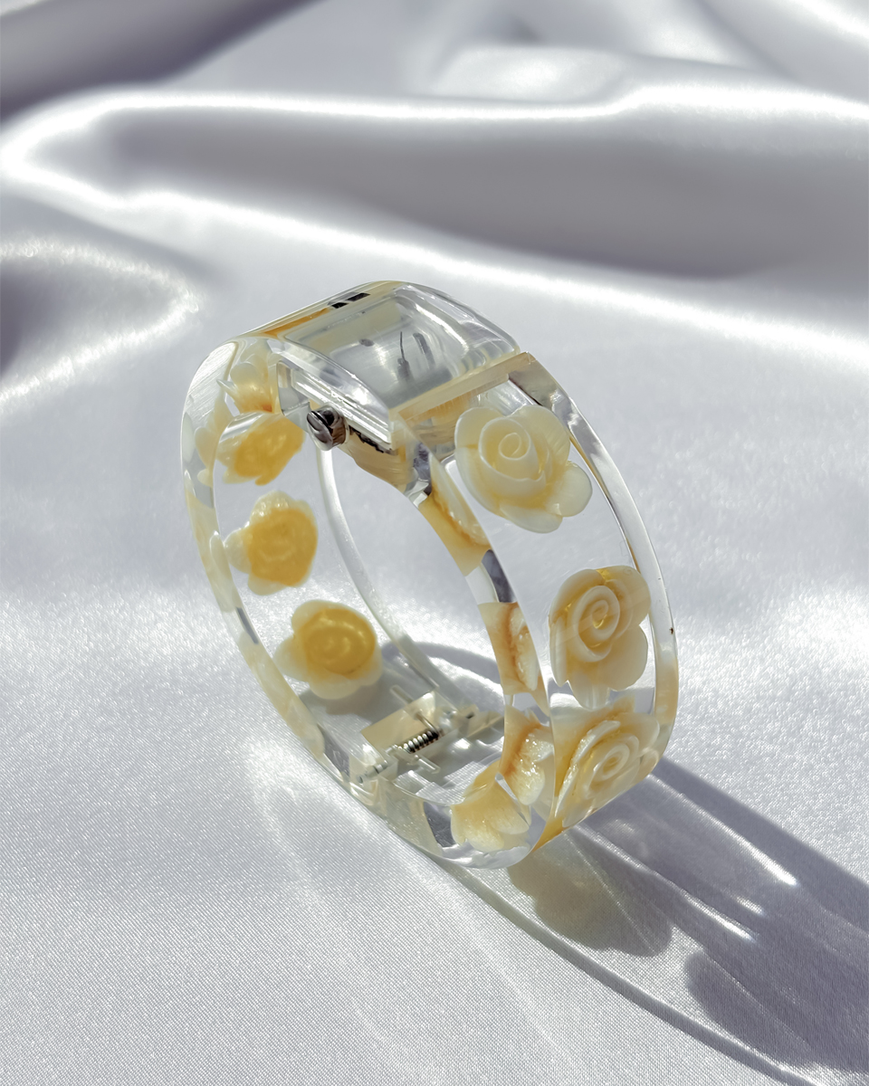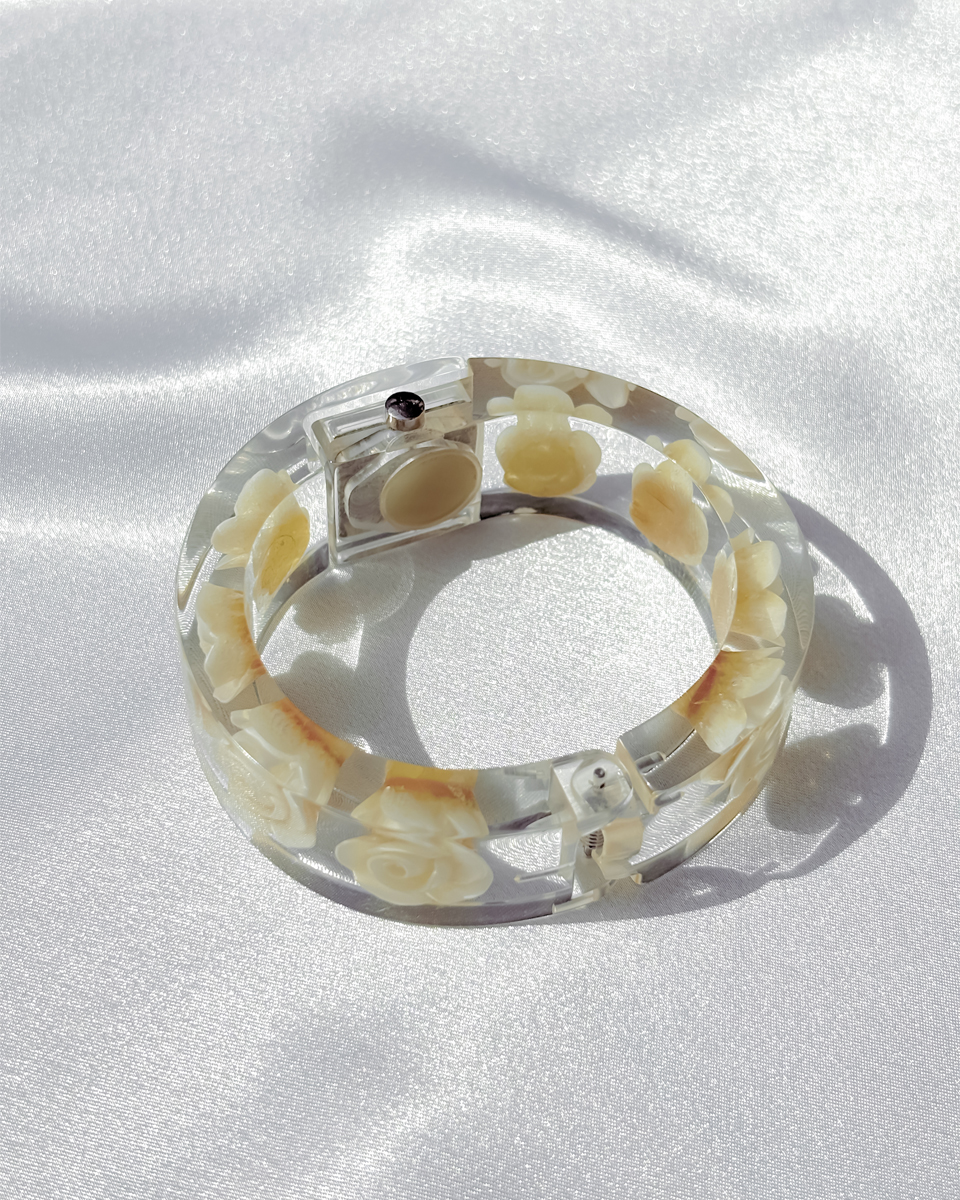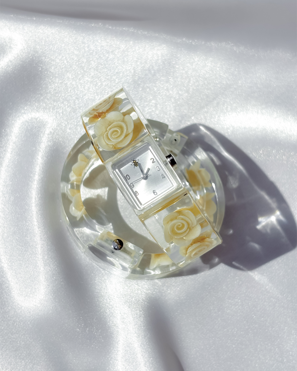 맑고 투명한 루사이트 소재로 제작된 뱅글 스타일의 빈티지 시계 두 점 입고되었입니다. 투명한 소재와 플로럴 디테일이 어우러진 유니크한 디자인이에요. 햇빛을 받을 때마다 유리처럼 빛을 반사하는 질감이 시원하고 깨끗한 인상을 줘요. 햇빛이 부서져 손목 위에서 가볍게 반짝이는 모습이 인상적이네요! 뱅글 내부에는 장미 모티브가 입체적으로 담겨 있어요. 착용했을 때 꽃이 은은하게 비쳐 보여서 독특한 분위기를 만들어내요. 같은 제품이지만 두 점이 미묘하게 다릅니다. 아래쪽에 각각 단독샷 남겨두었어요.