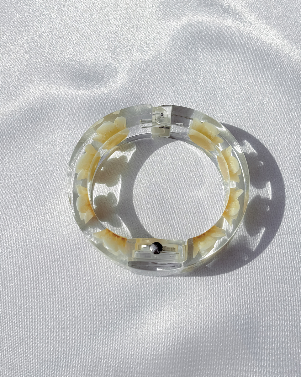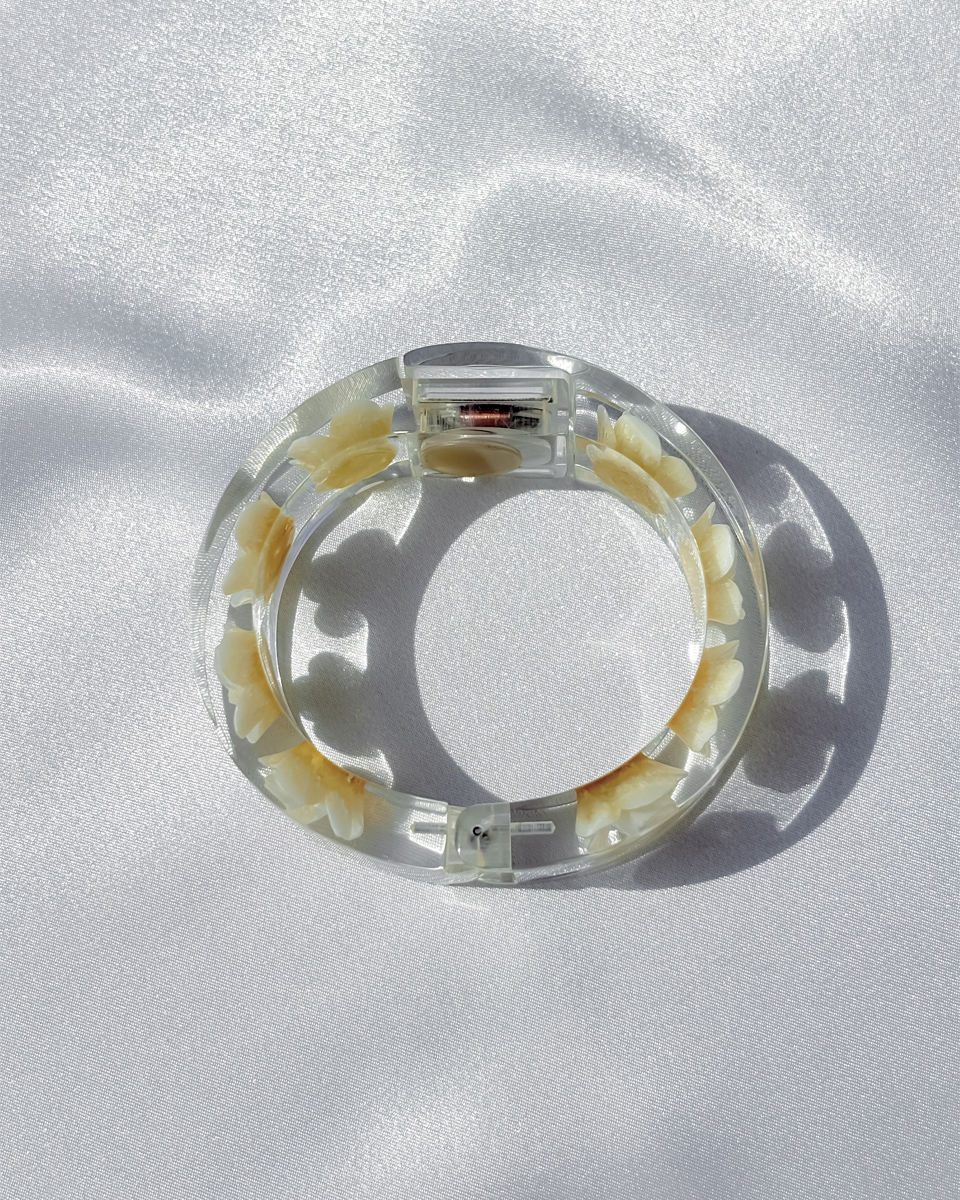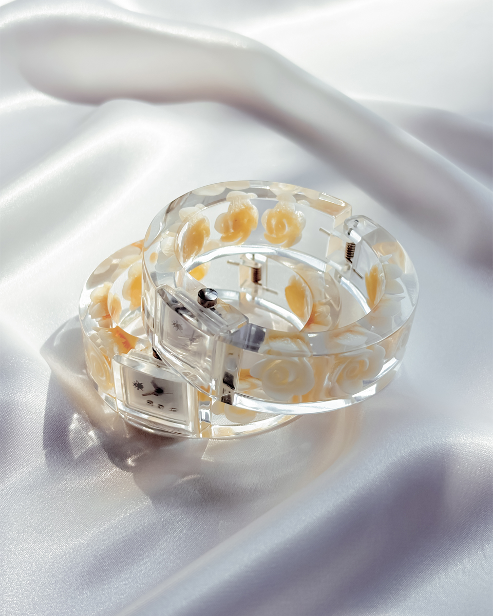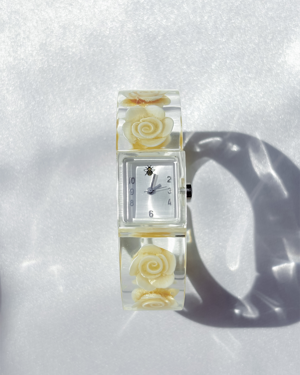 맑고 투명한 루사이트 소재로 제작된 뱅글 스타일의 빈티지 시계 두 점 입고되었입니다. 투명한 소재와 플로럴 디테일이 어우러진 유니크한 디자인이에요. 햇빛을 받을 때마다 유리처럼 빛을 반사하는 질감이 시원하고 깨끗한 인상을 줘요. 햇빛이 부서져 손목 위에서 가볍게 반짝이는 모습이 인상적이네요! 뱅글 내부에는 장미 모티브가 입체적으로 담겨 있어요. 착용했을 때 꽃이 은은하게 비쳐 보여서 독특한 분위기를 만들어내요. 같은 제품이지만 두 점이 미묘하게 다릅니다. 아래쪽에 각각 단독샷 남겨두었어요.