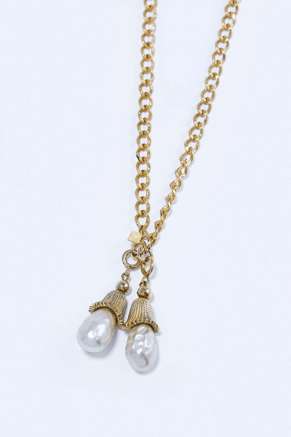 나란히 매달린 자연 바로크진주가 포인트로 고급스러운 무드의 빈티지 목걸이입니다. 유니크하고 빈티지한 디자인이 포인트가 되어서, 심플한 원피스나 셔츠에 매치했을 때 목걸이 하나만으로도 룩을 좀더 페미닌한 느낌으로 멋스러운 감각을 더할 수 있을 거 같아요. 체인 양끝과 진주 펜던트에 탈착가능한 고리가 달려있어서, 체인을 내맘대로 장식하는 재미가 있고 다양한 스타일링을 즐기실 수 있어요. 전반적인 컨디션은 양호한 편이지만 펜던트 부분에 전반적으로 빈티지제품 특유의 세월의 흔적이 묻어있어요.
