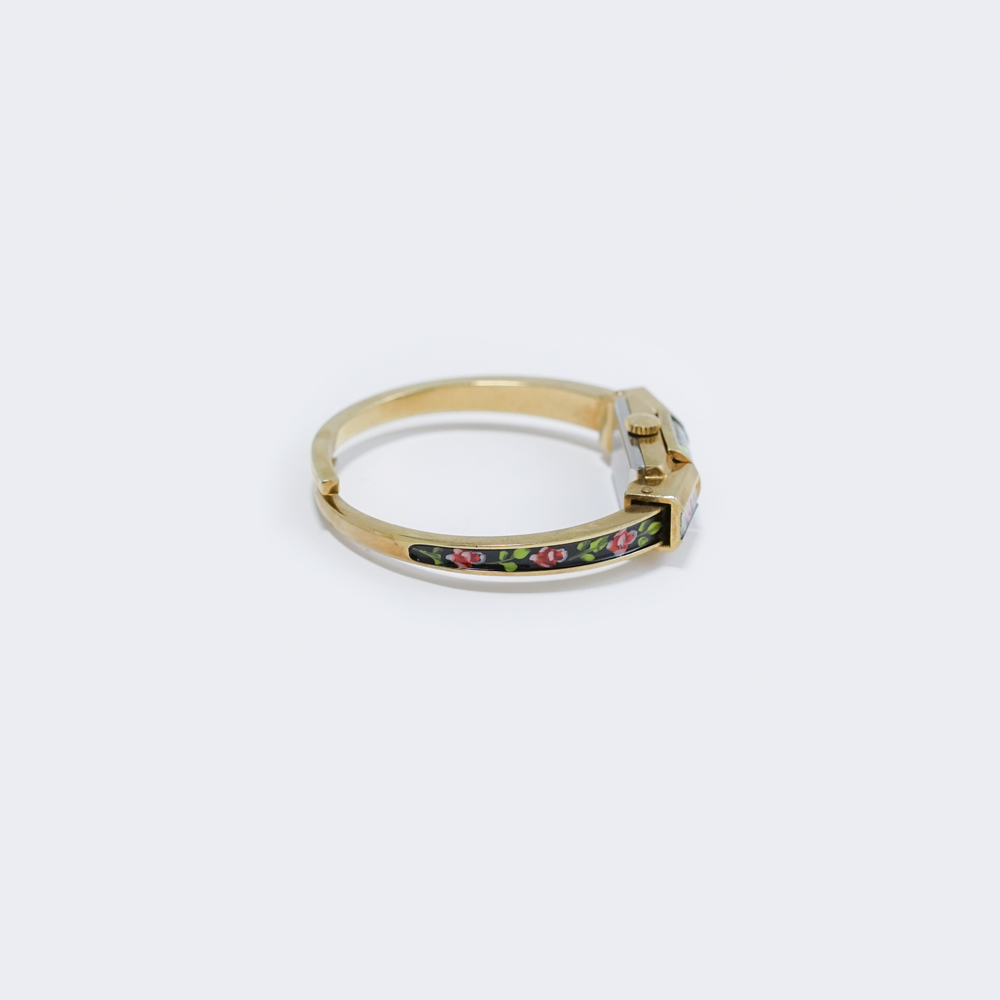 장미 무늬가 굉장히 아름다운 뱅글타입 50s 빈티지 시계입니다. 예전에 소개드렸던 흰색 장미 플립커버드 시계처럼, 커버를 열면 안에 숨어있던 시계가 뿅 나오는 로맨틱한 디자인이에요. 장미도 하나하나 핸드페인팅으로 그려져서 정말 아름다워요. 이런 시계들은 대체로 에나멜 위에 핸드페인팅으로 무늬를 그리고 코팅을 입혀 제작되곤 하는데, 보통은 세월이 흐르는 과정에서 어쩔 수 없이 에나멜이 떨어지는 경우가 많아요. 이 시계는 에나멜 상태도 좋고, 손으로 그린 꽃 부분의 손상도 없는 귀한 아이템이에요.