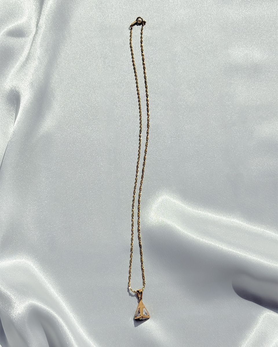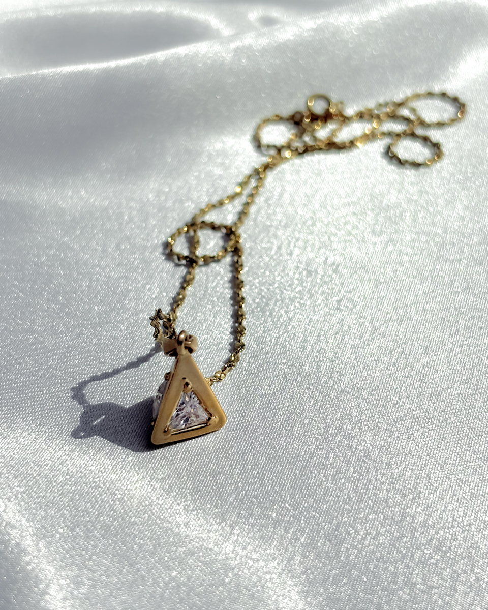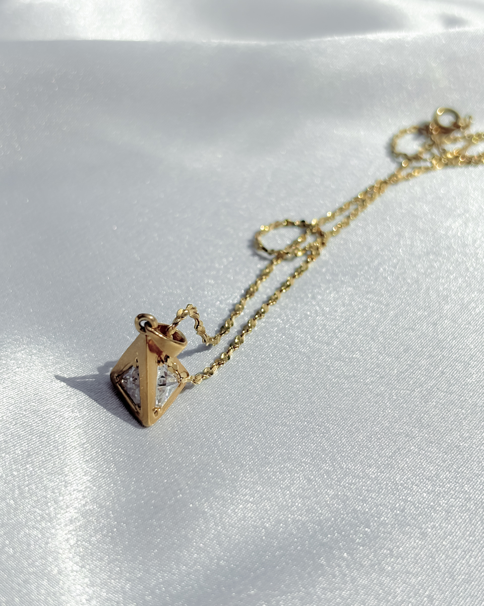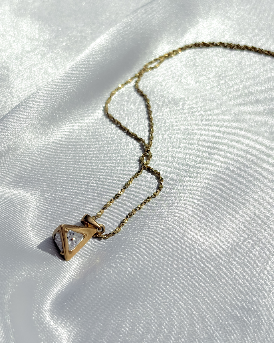 기하학적인 느낌의 삼각뿔 펜던트 안에 빛나는 다이아몬드가 쏙 들어간 독특한 디자인이 특징인 목걸이에요. 심플하고 깨끗하면서도, 투명한 디자인이라서 깔끔한 느낌으로 포인트를 줄 수 있는 네크리스입니다. 무난한 셔츠나 데일리한 스타일에도, 조금 화려하게 차려입은 날에도 예쁘게 매치하실 수 있을 거 같아요. 스톤 상태도 정말 좋고 도금에도 누락이나 변색 등 세월의 흔적은 거의 느껴지지 않아요. 새 것 같은 좋은 컨디션입니다.