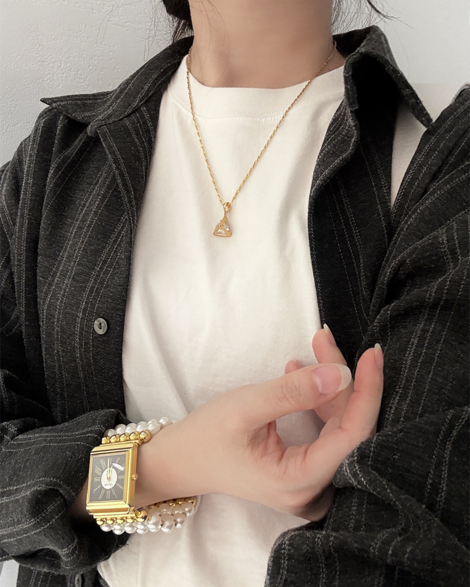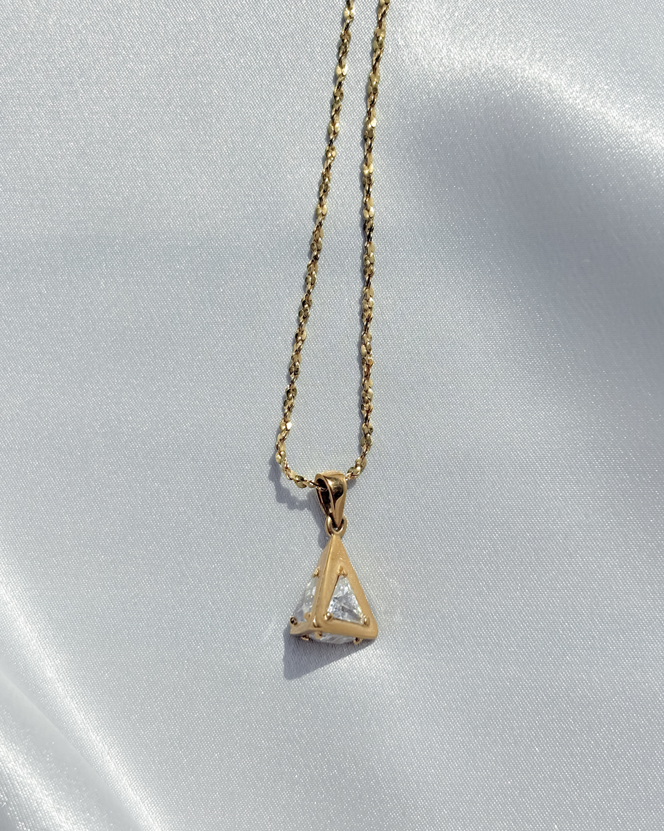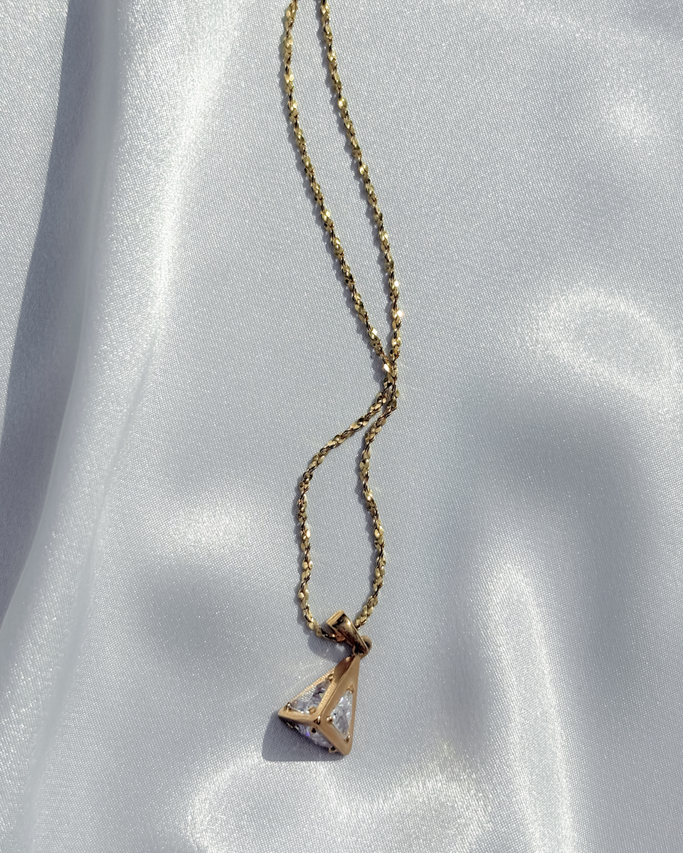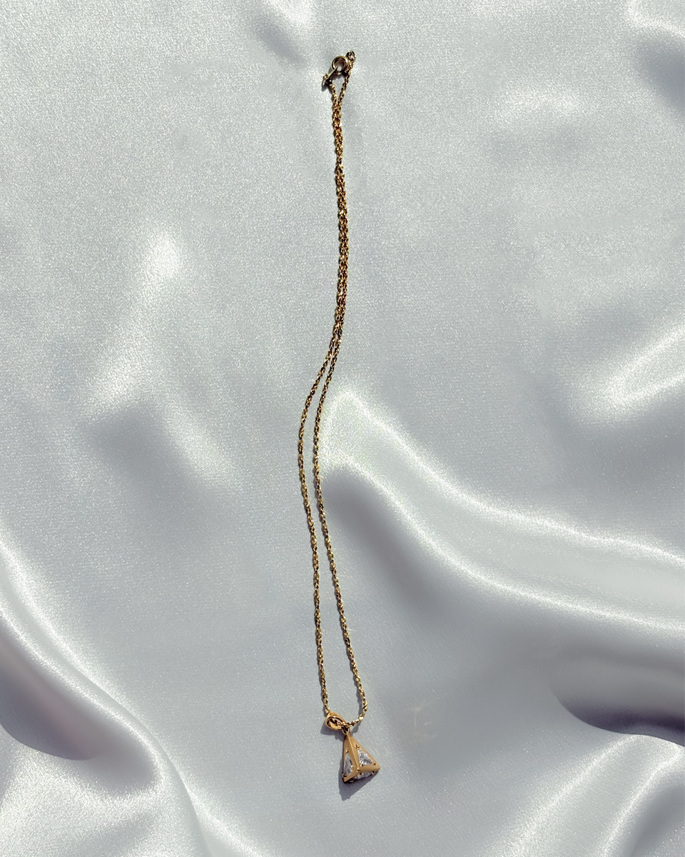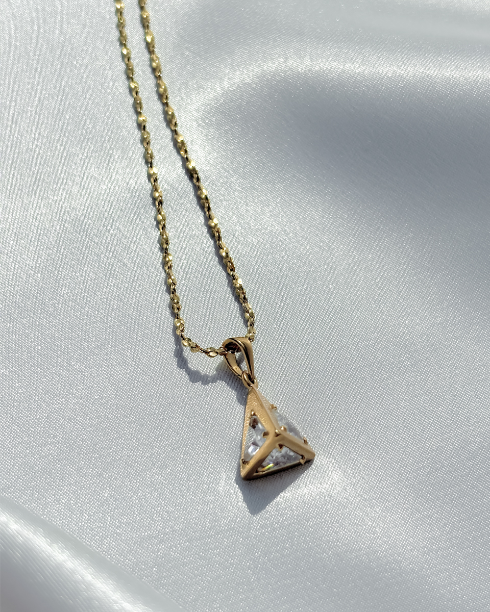 기하학적인 느낌의 삼각뿔 펜던트 안에 빛나는 다이아몬드가 쏙 들어간 독특한 디자인이 특징인 목걸이에요. 심플하고 깨끗하면서도, 투명한 디자인이라서 깔끔한 느낌으로 포인트를 줄 수 있는 네크리스입니다. 무난한 셔츠나 데일리한 스타일에도, 조금 화려하게 차려입은 날에도 예쁘게 매치하실 수 있을 거 같아요. 스톤 상태도 정말 좋고 도금에도 누락이나 변색 등 세월의 흔적은 거의 느껴지지 않아요. 새 것 같은 좋은 컨디션입니다.