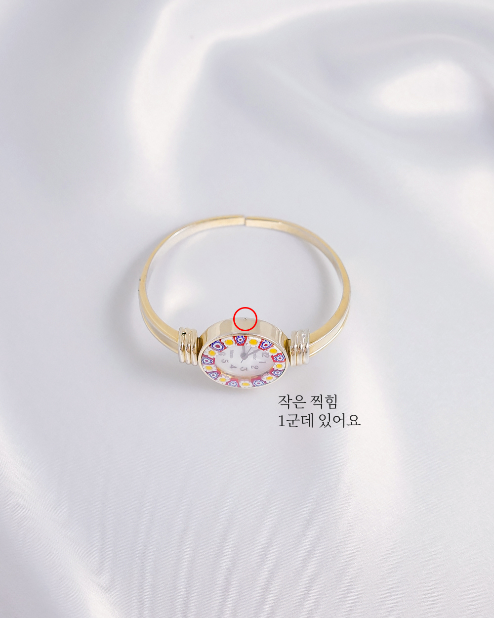 베네치아의 무라노 밀레피오리(Murano Millefiori) 유리로 장식된 베젤이 특징인 빈티지 시계입니다. 시계 베젤 전체를 장식하는 플라워 패턴이 유니크하면서도 아름답고 밀레피오리 유리 특유의 풍부하고 화사한 컬러감으로 손목을 화사하게 장식해주는 아이템이에요. 유리에 강한 빛을 비춰야 보이는 약간의 세월감과, 조그만 도금찍힘과 누락 1부분씩 있어요. 둘다 아래쪽이라 실사용시 크게 드러나는 부분은 아니지만 상세페이지 확인 부탁드릴게요!
